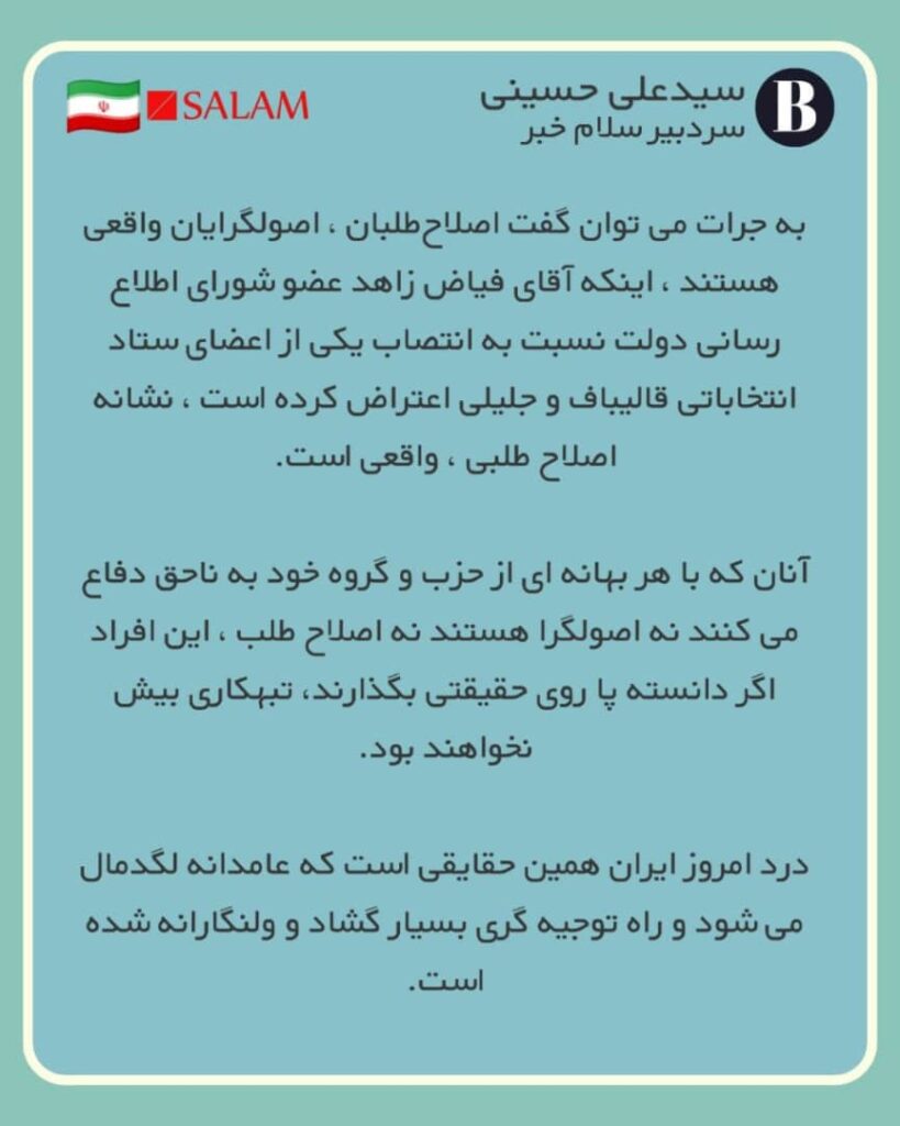 🔺 به جرات می توان گفت اصلاحطلبان ، اصولگرایان واقعی هستند ، اینکه آقای فیاض زاهد عضو شورای اطلاع رسانی دولت نسبت به انتصاب یکی از اعضای ستاد انتخاباتی قالیباف و جلیلی اعتراض کرده است ، نشانه اصلاح طلبی ، واقعی است.